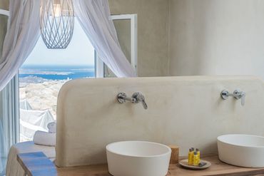 Mykonos High offers exclusive, luxurious privacy at its 20,000m2 estate at the top of the highest Mykonos hill of Kounoupas. The Villa is a complex of 4 independent suites with ensuite bathrooms . Decorated and furnished in earth light tones, each bedroom differs from the others, tailored to meet the highest expectations and has naturally made mattresses made of coco leaves and seaweed . Privacy is beyond mention. The uninterrupted and panoramic view of sunset and Mykonos island is unique and offers the perfect chilling as well as party spot.